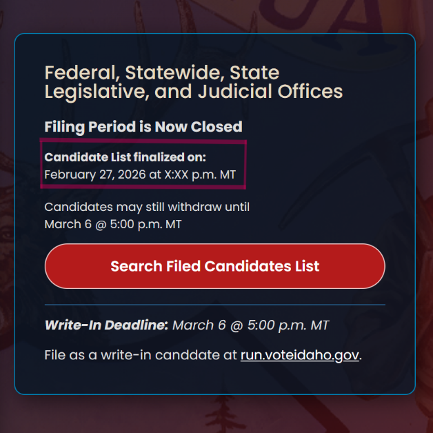 The list of candidates who file by 5 p.m. will not be immediately available on VoteIdaho.gov. Each submission must be reviewed and verified by the Secretary of State’s elections team to confirm eligibility. A comprehensive and vetted list of candidates is expected to be available later this evening. VoteIdaho.gov will feature a banner once the list is finalized, and updates will also be shared on the Secretary of State’s social media channels.